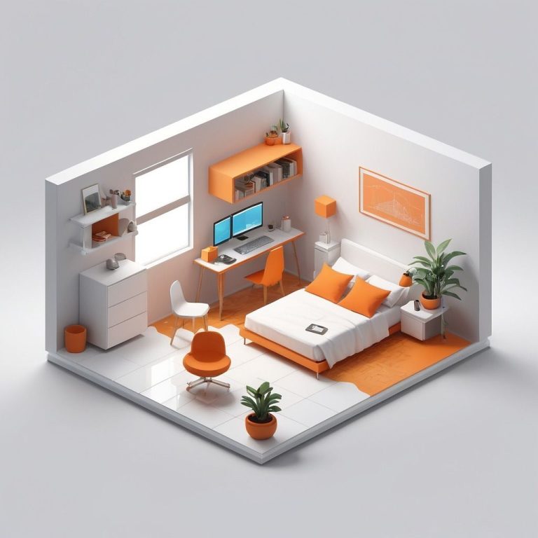 رنگ‌بندی این اتاق بر اساس ترکیب سفید و نارنجی انجام شده است که به ایجاد تعادل بین تمیزی و انرژی کمک می‌کند. سفید به عنوان رنگ غالب، حس گستردگی و روشنایی را ایجاد می‌کند، در حالی که نارنجی به عنوان رنگ تأکید، جنبه‌های زنده و خلاقانه فضا را برجسته می‌سازد. این ترکیب هم از نظر بصری جذاب و هم از نظر روانی انگیزش‌بخش است.